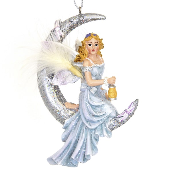 Zittende Fee in maan als kerstornament voor in de kerstboom. Een Fee in maan als kerst ornament uit de Frosted Kingdom kerstcollectie van Kurt S. Adler. Met de primaire kleuren blauw en wit voor een sprookjesachtige kerstsfeer.