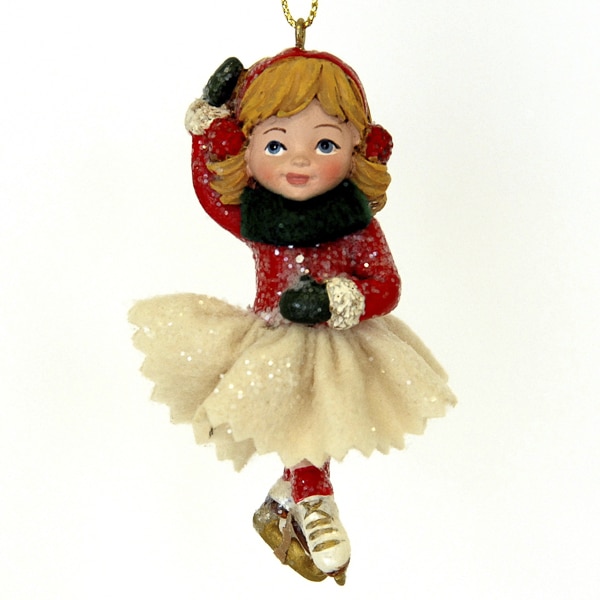 Vintage kerst ornament – schaatsend meisje met hand op hoofd